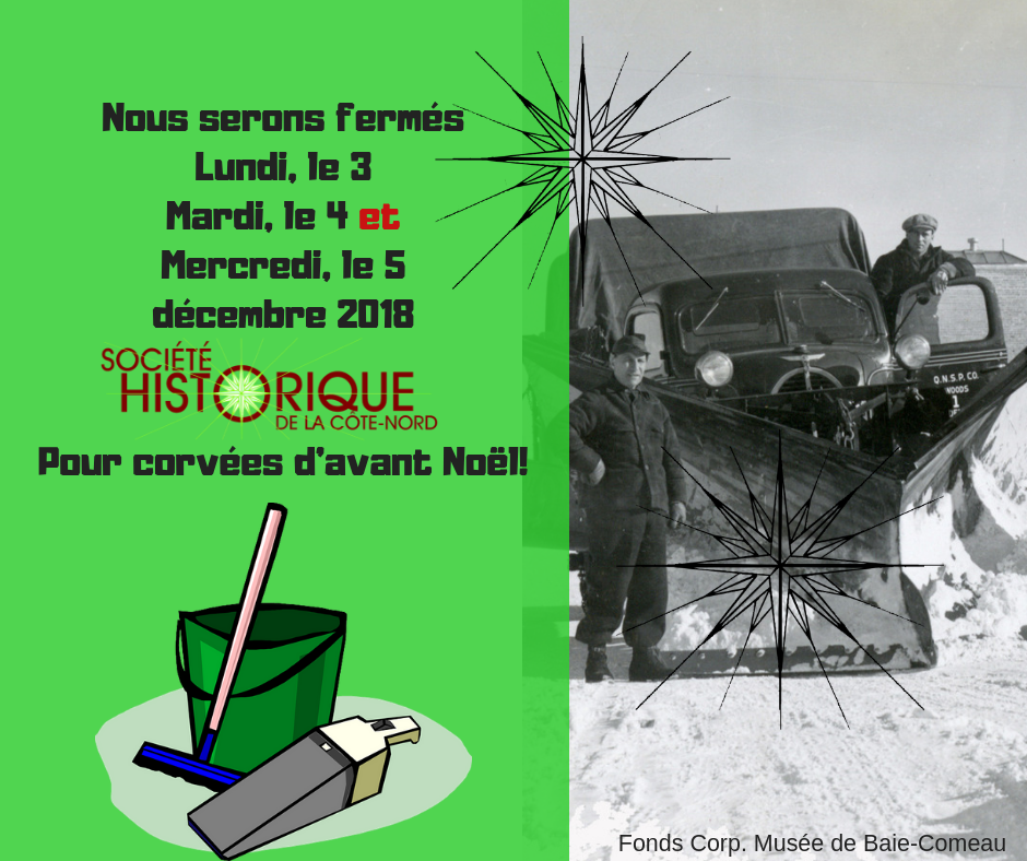 La Société historique de la Côte-Nord sera fermée du 3 au 5 décembre 2018 pour des travaux d’aménagement de ses locaux. Merci de votre compréhension.